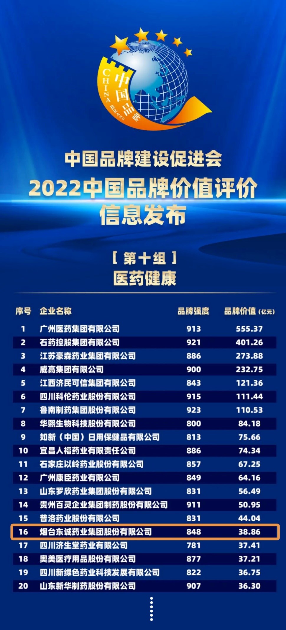 9月5日,“2022中國(guó)品牌價(jià)值評(píng)價(jià)信息”在北京發(fā)布,東誠(chéng)藥業(yè)再次入圍醫(yī)藥健康類(lèi)榜單,位列第16位。